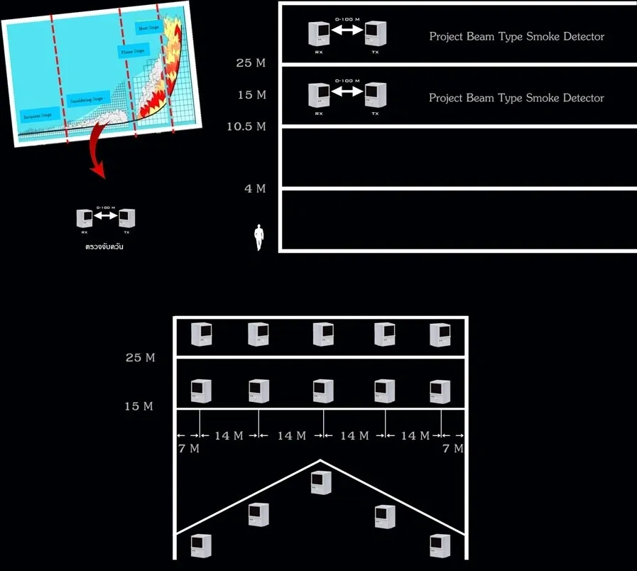 ระยะที่แนะนำในการติดตั้ง Project Beam Type Smoke Detector คือความสูงเกิน 10.5 เมตร ระยะห่าง 7 เมตร