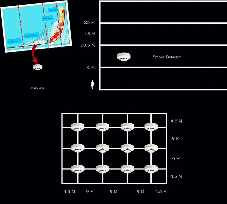 ระยะที่แนะนำในการติดตั้ง Smoke Detector คือความสูงไม่เกิน 10.5 เมตร ระยะห่าง 4.5 เมตร